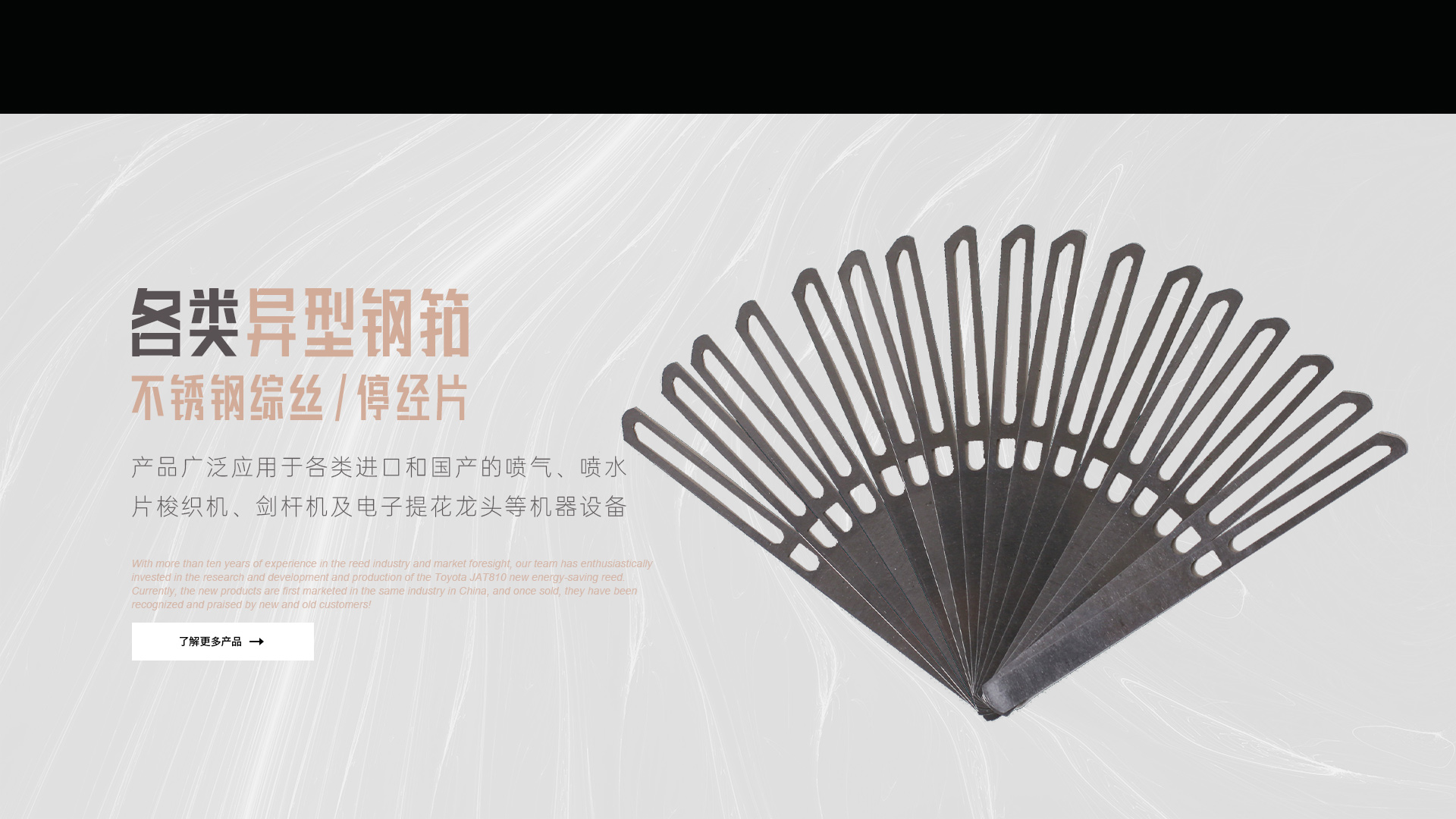 從事研發(fā)生產(chǎn)及銷(xiāo)售各類(lèi)新型紡織器材的生產(chǎn)型企業(yè)。公司主要產(chǎn)品有:噴氣織機(jī)用各類(lèi)異型鋼筘(傳統(tǒng)型豐田JAT710鋼筘及新研發(fā)的豐田JAT810節(jié)能筘);不銹鋼綜絲及不銹鋼停經(jīng)片。我們的產(chǎn)品廣泛應(yīng)用于各類(lèi)進(jìn)口和國(guó)產(chǎn)的噴氣、噴水、片梭織機(jī)、劍桿機(jī)及電子提花龍頭等機(jī)器設(shè)備。